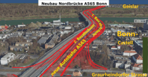 Die Bonner Autobahnen A565 und A59 quer durch Bonn und Beuel sollen auf insgesamt 8 Streifen ausgebaut werden: 6 Fahr- und 2 Standstreifen sowie Abbiegestreifen. Das bedeutet: Vollständiger Verlust der Gehölzbestände an den Böschungen, die mindestens 40.000 Bäume an den Bonner Autobahnen A565 und A59 sollen gefällt werden. Und jetzt: Menschen werden ihre Wohnungen verlieren beim Neubau der Nordbrücke: Die 6-streifige Nordbrücke „Friedrich-Ebert-Brücke“ soll abgerissen, der Neubau sogar insgesamt 11 Streifen bekommen. Wohn- und auch Geschäftshäuser sollen dafür abgebrochen werden; für einen Radweg sieht die Autobahn GmbH keine Möglichkeit. Ein Milliardengrab!