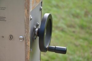 „Hallo und willkommen auf dem Walderlebnispfad“, tönt es aus der Zwitscherkiste. An der ersten Station kann man sich einen ersten Überblick verschaffen – über die weiteren fünf Stationen des Erlebnispfades und über das Ökosystem des Waldes. Die Informationen der Audio-Station muss man sich allerdings erarbeiten. Nur wer fleißig an der Kurbel dreht, produziert den notwendigen Strom, der die Kiste sprechen lässt.