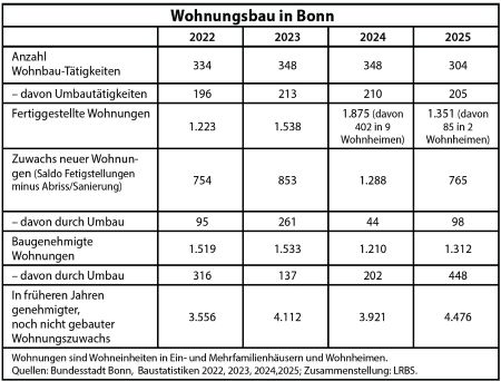 Das Jahr 2024 war in Bonn trotz Krise wesentlich positiver für den Neubau, mit einem Zuwachs von 1288 Neubauwohnungen, davon 44 durch Umbau. Selbst wenn man die neun (9!) Wohnheime mit 402 neuen Wohnungen herausrechnet, erlebte Bonn 2024 laut Statistik eher keine Neubaukrise, und das Neubaukrisenjahr 2025 fiel sogar etwas besser aus als 2022. Bemerkenswert sind auch die neuen Wohnheime und Arbeitgebereigenen Unterkünfte für Fachkräfte in Mangelberufen.